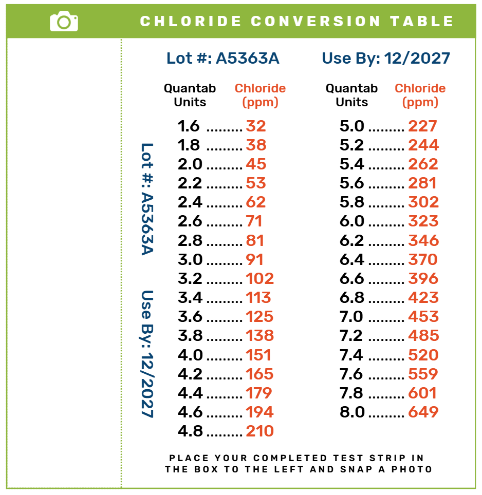 Please don’t try to estimate the average chloride concentration between two Quantab units on the test strip. Find the closest unit, skewing higher if the measurement is truly in the middle, to find the corresponding chloride measurement on the chart.
